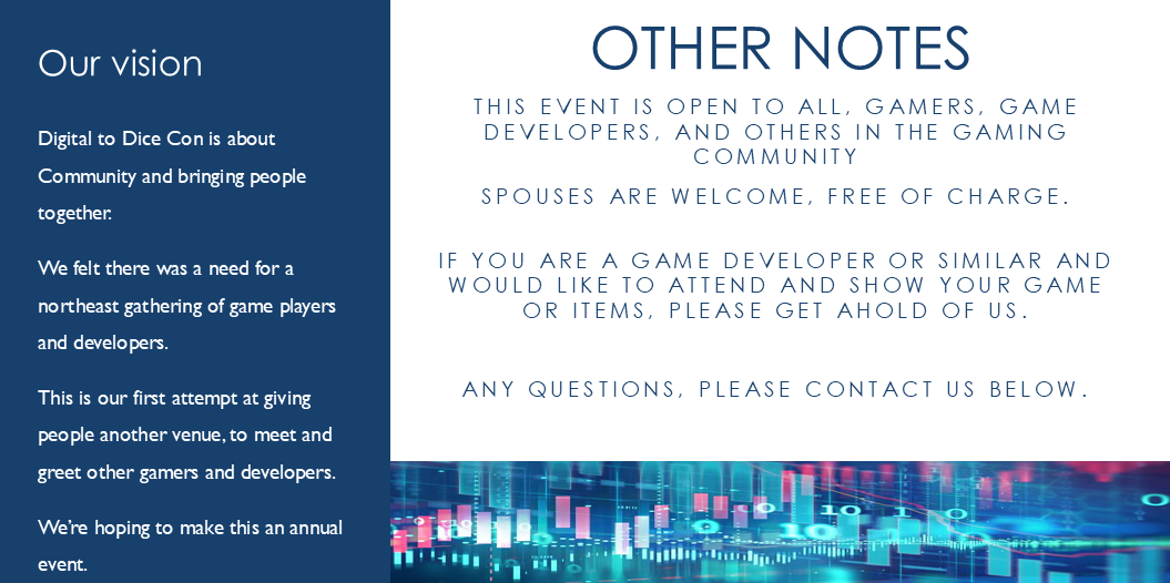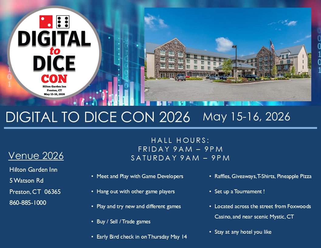 like to invite everyone to Digital to Dice Con 2026 !!!It is a gathering of game players and developers in the northeast, hosted by the Digital to Dice podcast. |